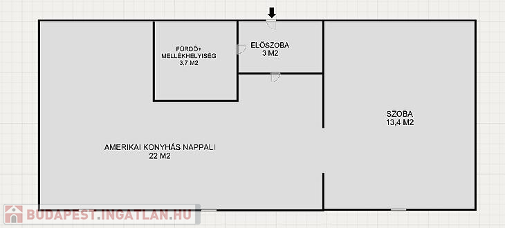 Tágas amerikai konyhás nappali, szoba, konyha, fürdőszoba- mellékhelyiség egyben és előszoba áll rendelkezésre.