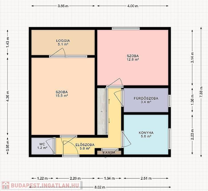 A lakás 52m2-es, tégla építésű, 4nm loggiával.