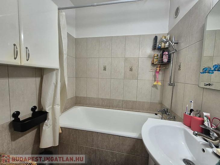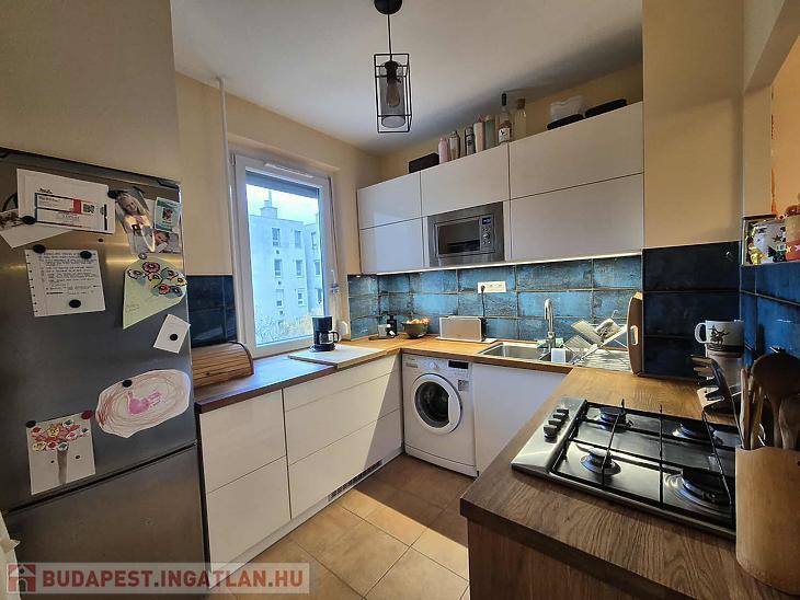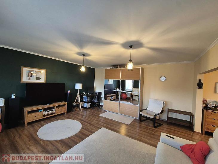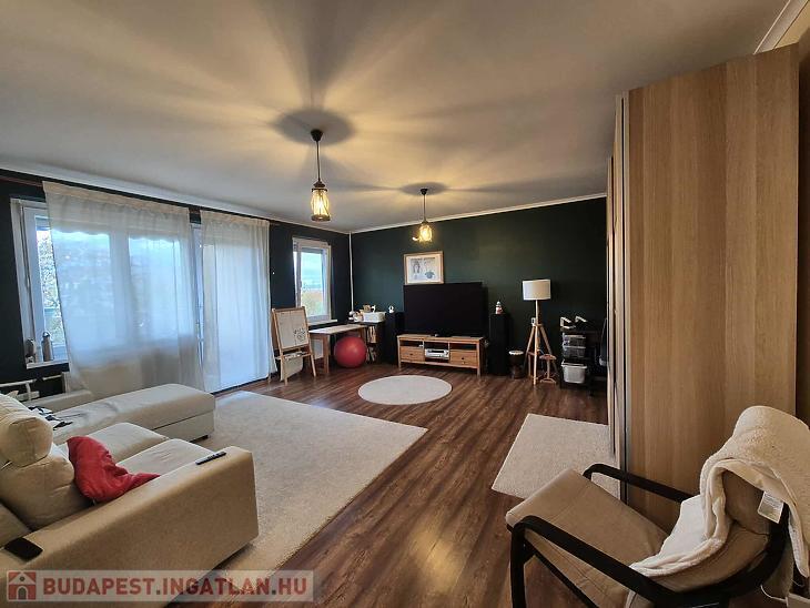 A lakás jó elosztású, világos, a szobákban jó minőségű laminált parketta található a többi helyiség járólappal burkolt. Az otthon melegéről házközponti kazán gondoskodik. A nyílászárók műanyag thermo üvegesek, redőnnyel ellátottak. A beépített bútorok a vételár részét képezik (konyhabútor gépesítve és előszobabútor). A nappaliból csatlakozik az erkély, amely szép kilátást biztosít a Budai hegyekre.