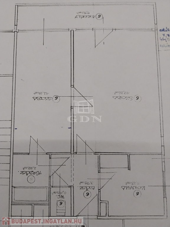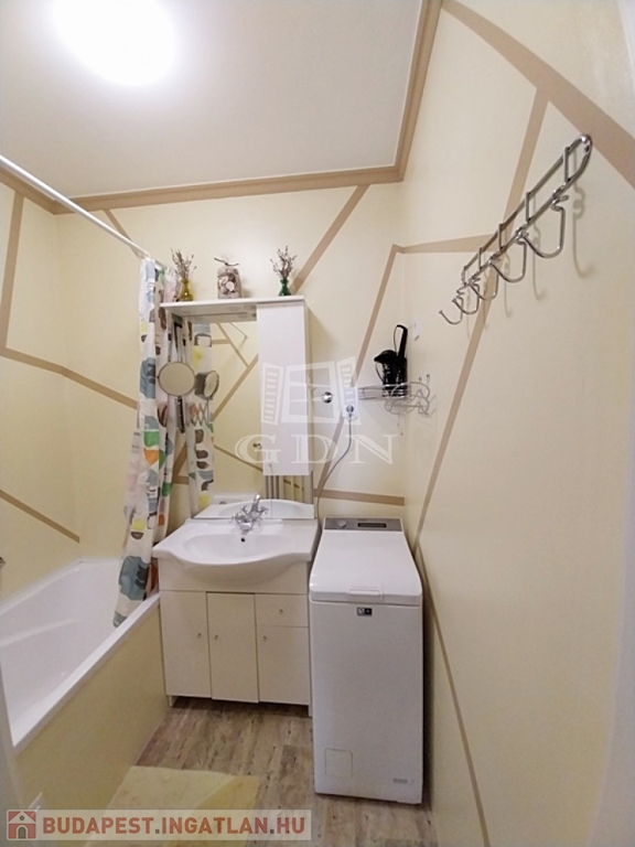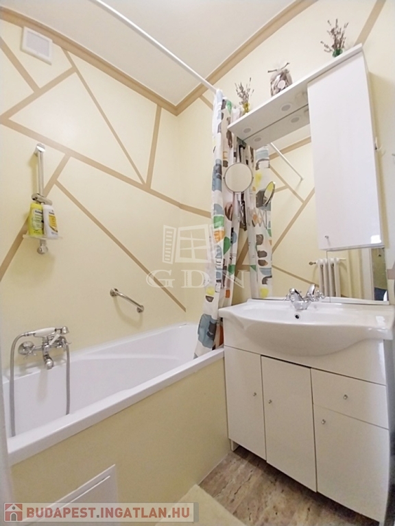 Bal oldalon kapott helyet a külön nyíló tartó szekrénnyel felszerelt 1 nm-es WC, mellette a 3 nm-es kádas újonnan kialakított fürdőszoba.