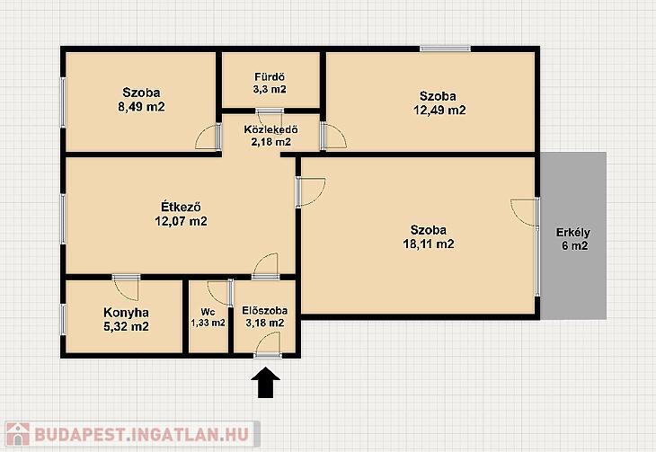 3 szoba, konyha, étkező, kádas fürdőszoba, külön wc, közlekedő, előszoba, erkély