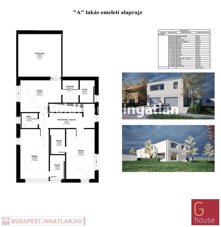 Az „A” lakás 191,78 m² nettó alapterületű, négy szobás, négy fürdőszobás, 196,16 m² kerttel, 23,36 m² emeleti terasszal és garázzsal, ára 193.200.000 Ft.