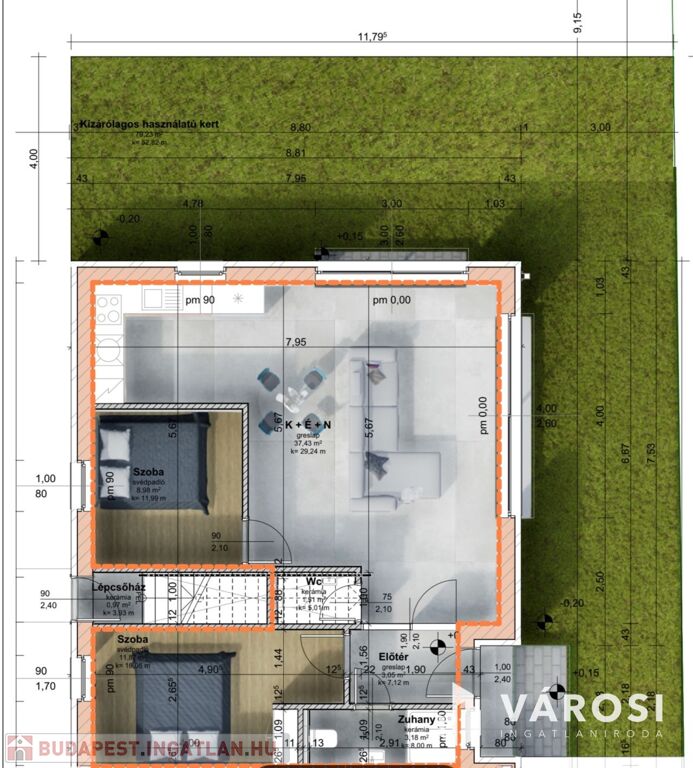 A lakáshoz saját, kizárólagos használatú 80 m2-es kert tartozik, amely ideális pihenésre, családi programokra, vagy akár konyhakert kialakítására is.