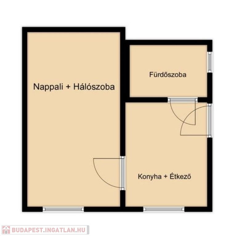 A lakásba belépve a bejárati ajtón keresztül közvetlenül a nyitott világos konyhába jutunk. Innen jobbra nyílik a fürdőszoba, ami teljes felújításra szorul. A konyhából nyílik a nappali ami egyben a hálószoba is.
