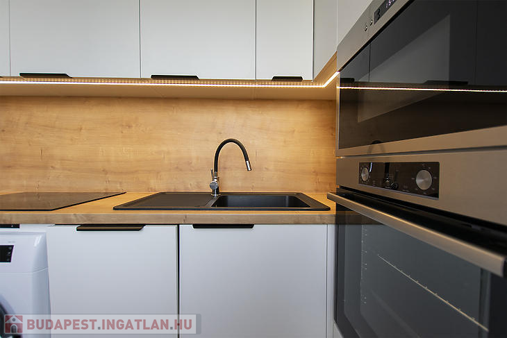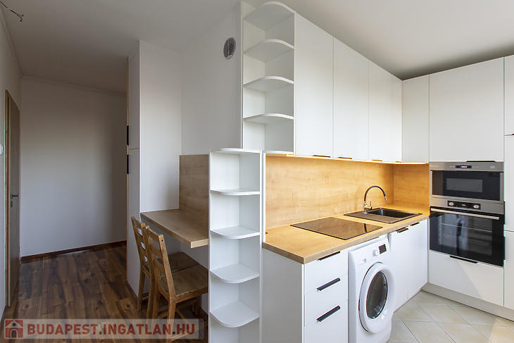 A konyha praktikus kialakítású, beépített sütővel, főzőlappal és mosogatógéppel felszerelt, így minden adott a kényelmes főzéshez. A fehér szekrények és a fa hatású munkalapok harmonikus, letisztult hangulatot teremtenek. A konyha mellett egy kis étkezőrész is kialakításra került, amely ideális egy gyors reggelihez vagy egy kellemes vacsorához.