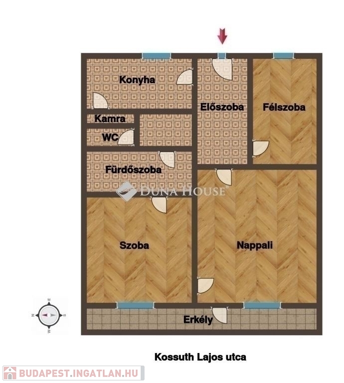 A 68 m² jól használható tér klasszikus, élhető elrendezés, 3 különnyíló szoba, Loggia + külön erkély , ház tégla építésű.