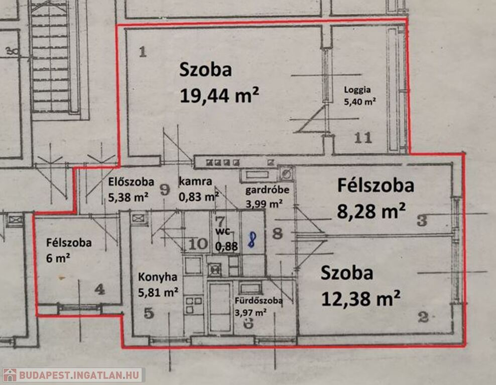 A lakás elrendezése praktikus: 2 szoba + 2 félszoba, konyha, kamra, előszoba, külön WC, fürdőszoba, gardrób és 5,40 m² loggia tartozik hozzá. A helyiségek világosak, jó természetes megvilágítással rendelkeznek. A konyha, az egyik félszoba és a fürdőszoba délre néz, míg a többi helyiség keleti tájolású. A fűtést gázcirkó biztosítja, a melegvíz-ellátás villanybojlerrel történik. A szobák parkettaburkolatúak, a többi helyiség mettlachi burkolattal ellátott. A lakás műszaki állapota közepes, ugyanakkor megkímélt állapotú, nem lelakott, jelenleg egy tisztasági festés után is lakható. A nyílászárók eredeti Teassauer típusú ablakok, amelyek korszerűsítése a jövőben indokolt lehet. A lakáshoz saját pincerész is tartozik, valamint a társasházban babakocsitároló is rendelkezésre áll.