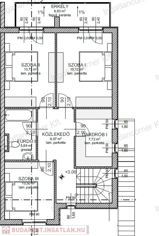 •Emelet: 3 szoba, gardrób, fürdő, 9,77 m² erkély