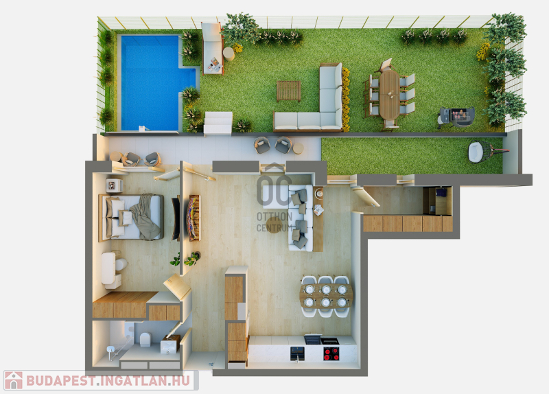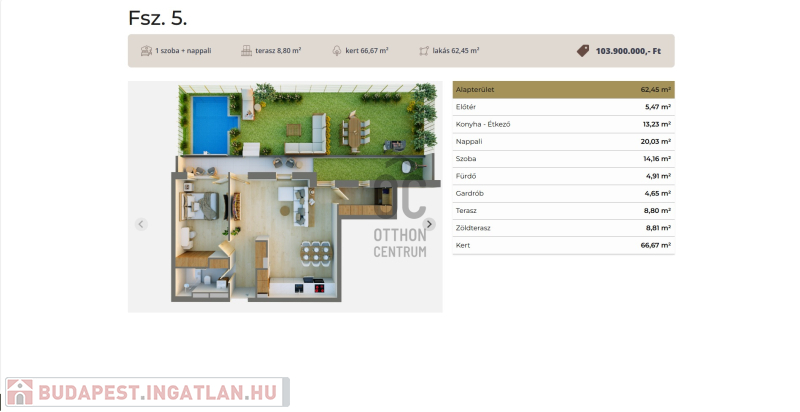 Ez a földszinti kertkapcsolatos lakás 62,45 nm-es, nappali-étkező-konyha +1 szobás, 8,8 nm-es terasszal és 67 nm-es kerttel.