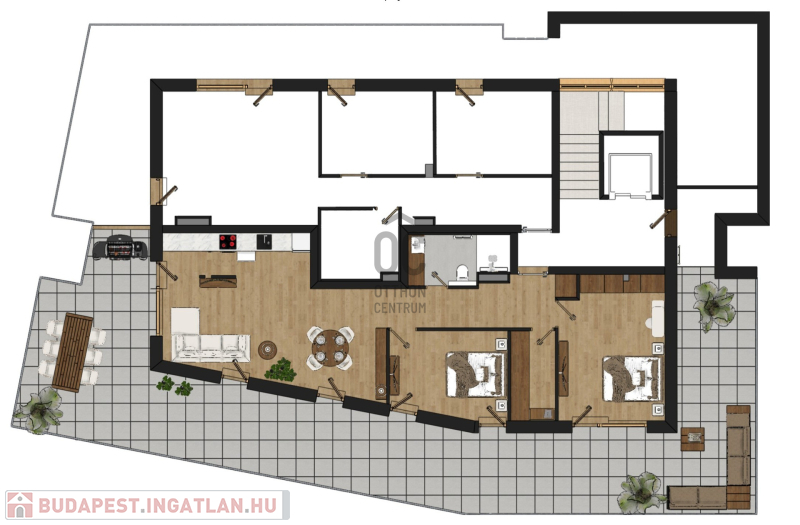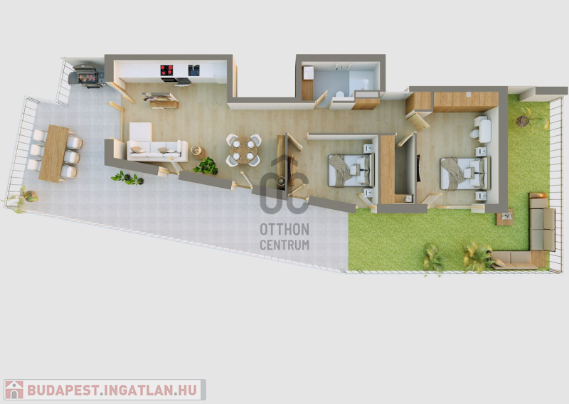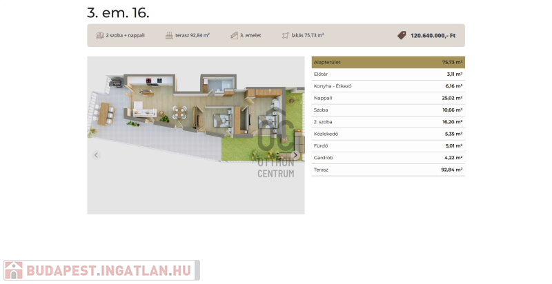 Ez a 3. emeleti penthouse lakás 75,73 nm-es, nappali-étkező-konyha +2 szobás, 93 nm-es tetőterasszal.