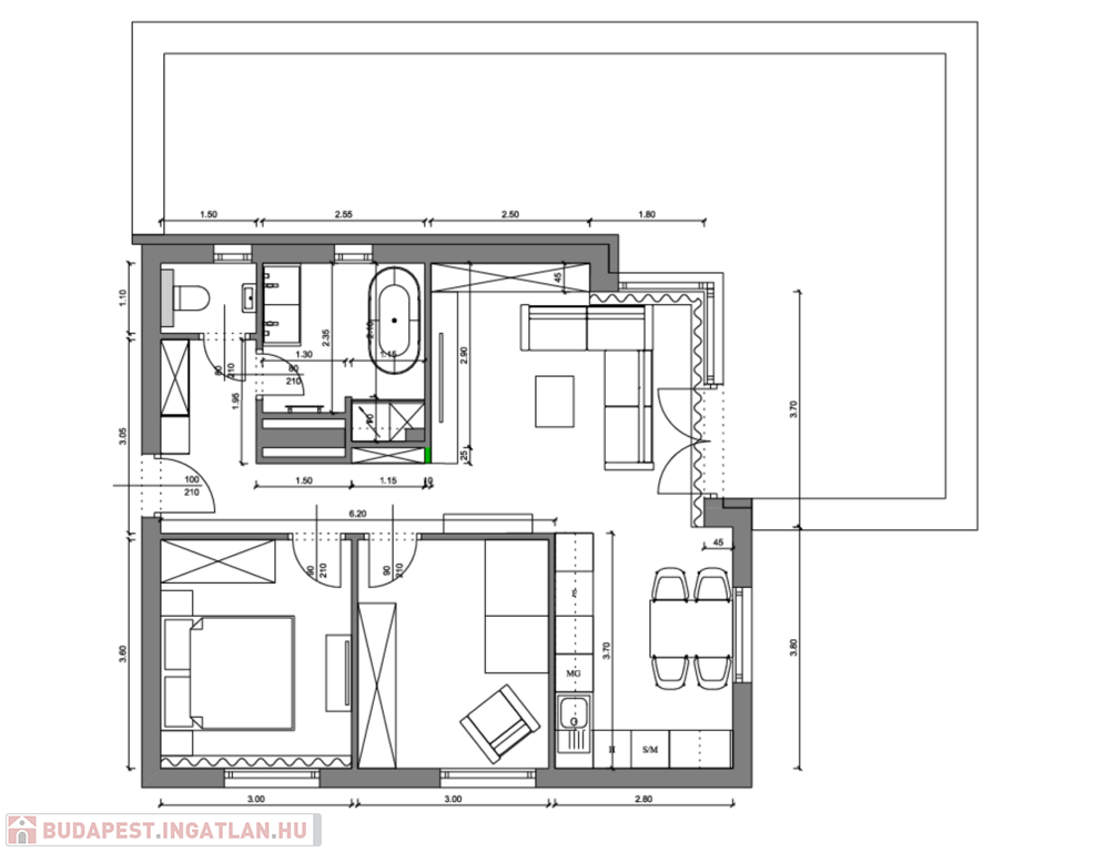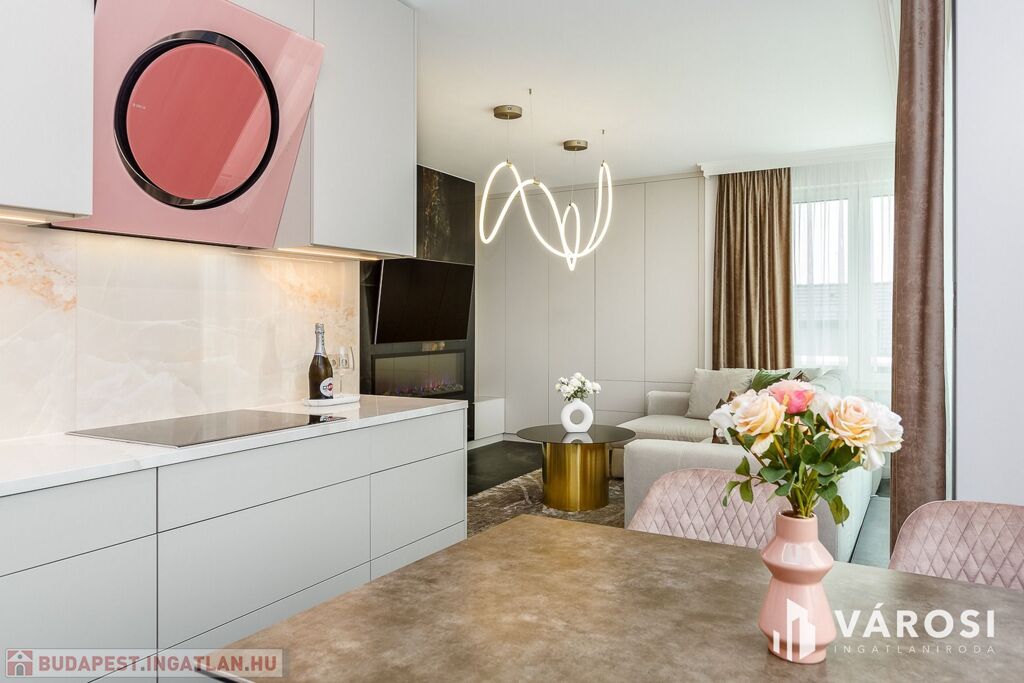 - **Helyiségek:** 2 szoba, 1 nappali, amerikai konyha, fürdőszoba és külön WC a maximális kényelem érdekében.
