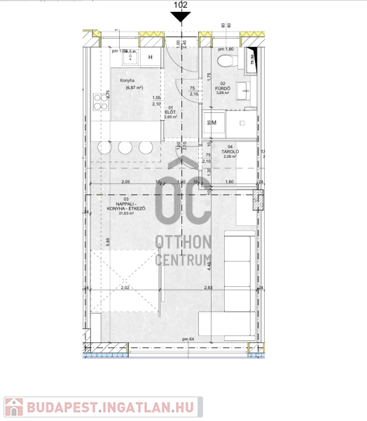 Ez az 1. emeleti lakás 40,25 nm-es, nappali-étkező- amerikai konyhás.