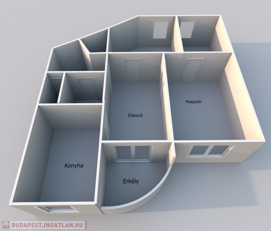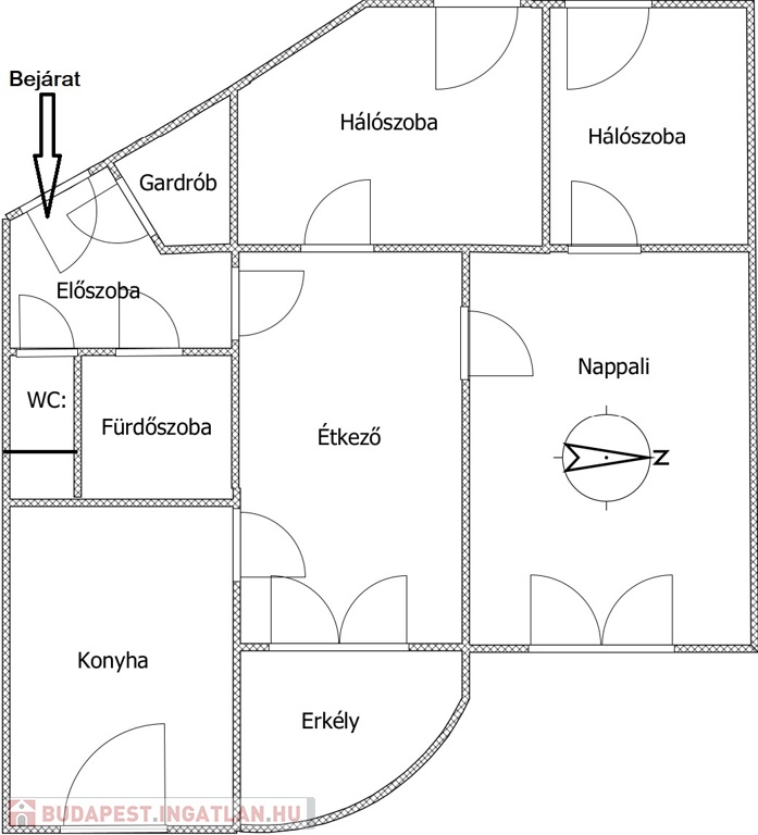 - Helyiségei: előszoba, gardrób, konyha, étkező, nappali + 2 szoba, fürdőszoba, WC külön.