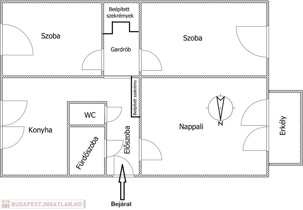 - Helyiségei: előszoba,3 külön nyíló szoba, étkezőkonyha, fürdőszoba, WC külön, gardrób, erkély.
