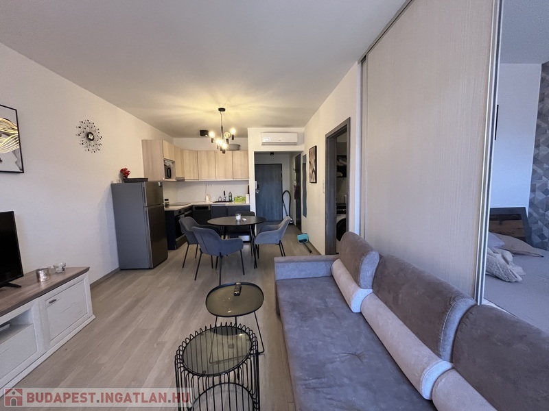 Modern és Praktikus Elrendezés: Az amerikai konyhás nappali tágas és világos teret biztosít a mindennapi élethez és a vendégfogadáshoz. Az egy külön szoba pedig nyugodt pihenést garantál.