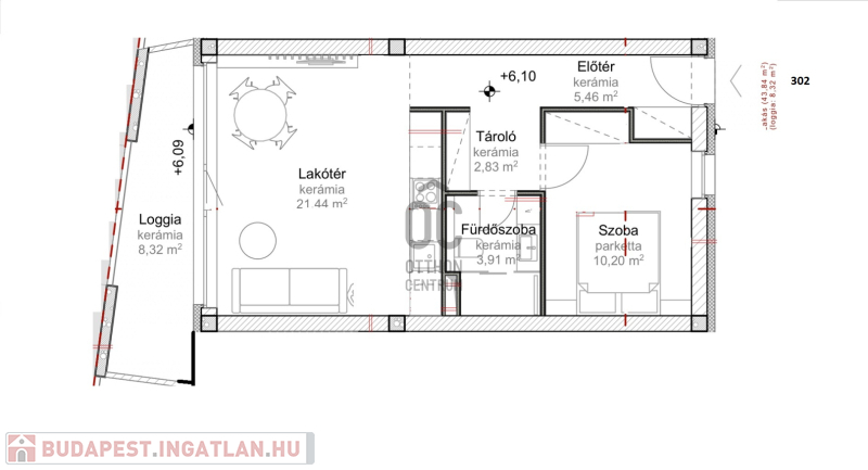 Ez az 3. emeleti lakás 43,84 nm-es, nappali-étkező-konyha +1 szobás, 8,32 nm-es loggiával.