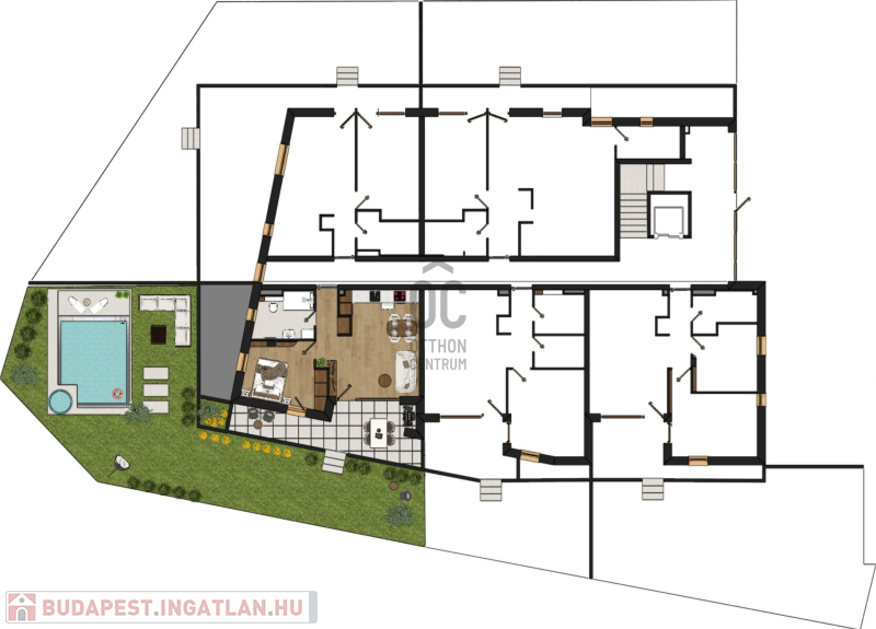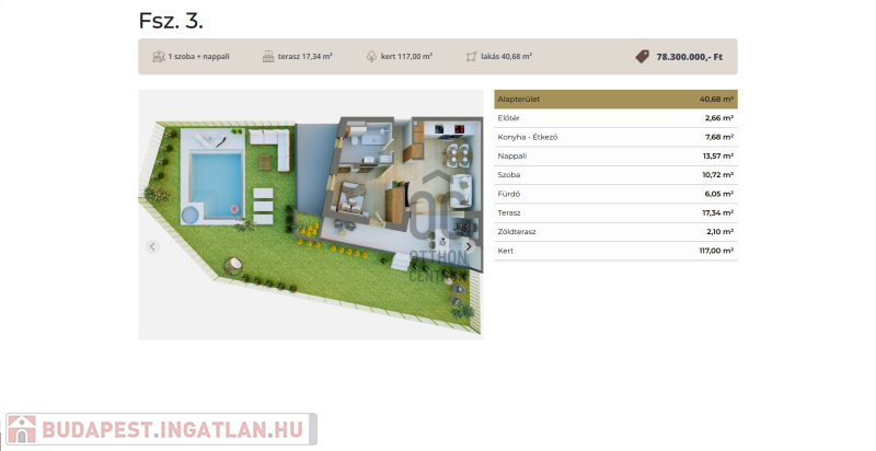 Ez a földszinti kertkapcsolatos lakás 40,68 nm-es, nappali-étkező-konyha +1 szobás, 17 nm-es terasszal és 117 nm-es kerttel.