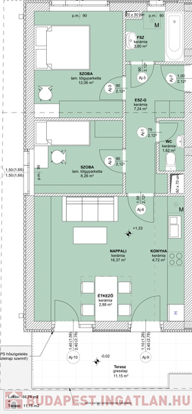 (Konyhában munkapult feletti 60 cm sáv, teljes hosszban. Fürdõszoba, toalett, közlekedõ, nappali- konyha teljes burkolását az ár tartalmazza)