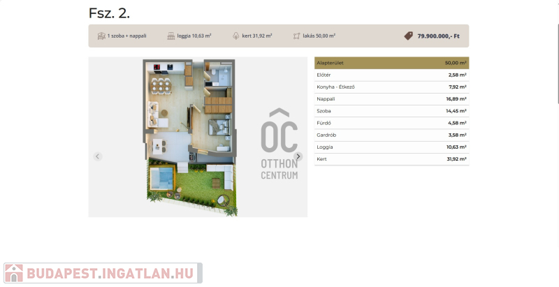 Ez a földszinti kertkapcsolatos lakás 50 nm-es, nappali-étkező-konyha +1 szobás, 10,6 nm-es terasszal és 32 nm-es kerttel.