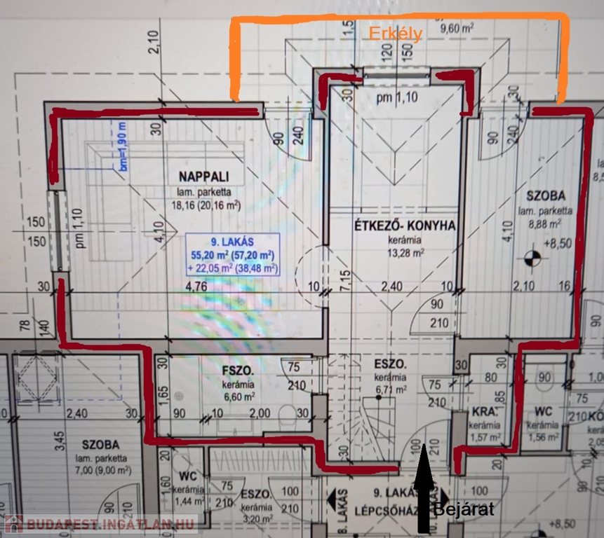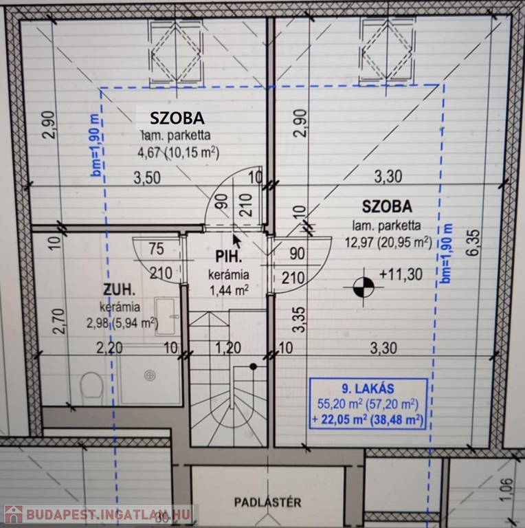 Az ingatlan pontos méretei: Nettó alapterület 95.68m², ebből a hasznos alapterület, ahol a belmagasság legalább az 1,90 métert eléri 77.25m².