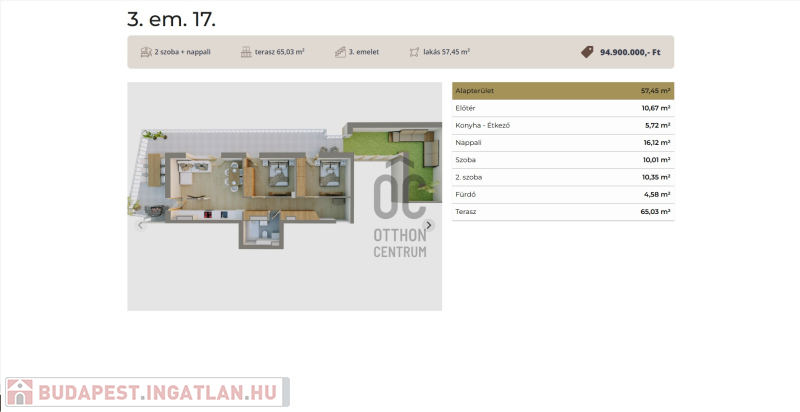 Ez a 3 emeleti penthouse lakás 57,45 nm-es, nappali-étkező-konyha +2 szobás, 65 nm-es tetőterasszal és 32 nm-es.