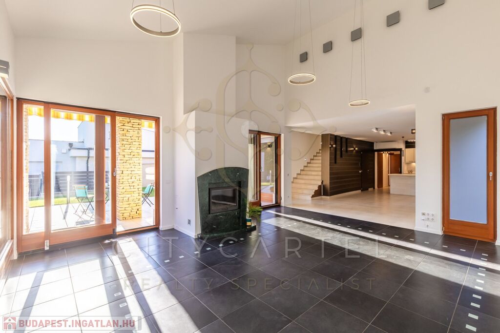 Amerikai konyhás nappali fatüzeléses kandallóval, nagy belmagassággal, közvetlen kapcsolat a kertkapcsolatos teraszokhoz