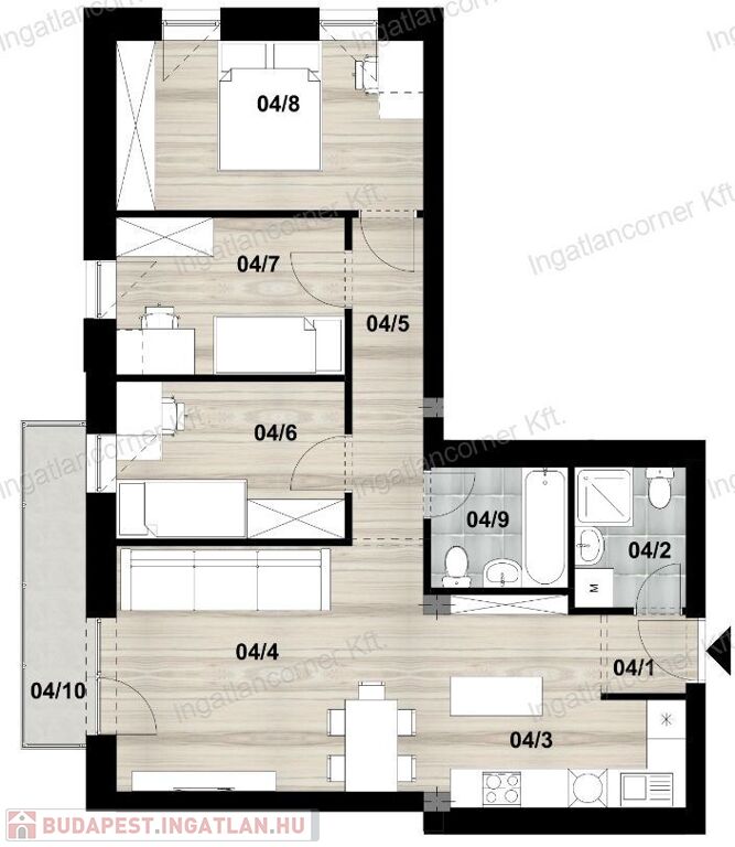 - 44 nm-es lakás: előszoba, nappali-konyha-étkező, fürdő, egy 12 nm-es szoba és 5 nm-es erkély.