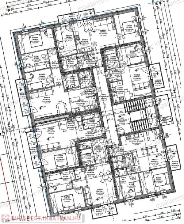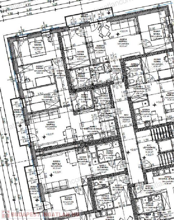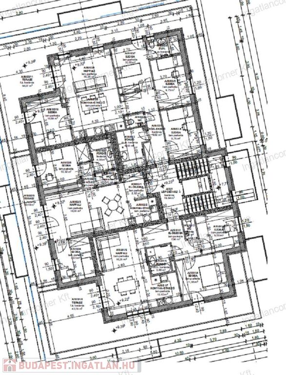 - 90 nm-es lakás: közlekedő, nappali-konyha-étkező, fürdő, wc, zuhanyzó, három 10 és egy 11 nm-es szoba, valamint 54 nm-es terasz.