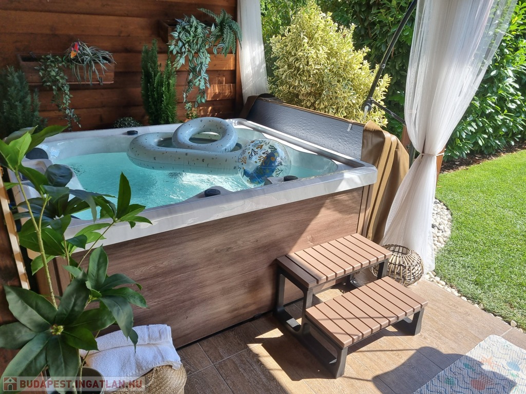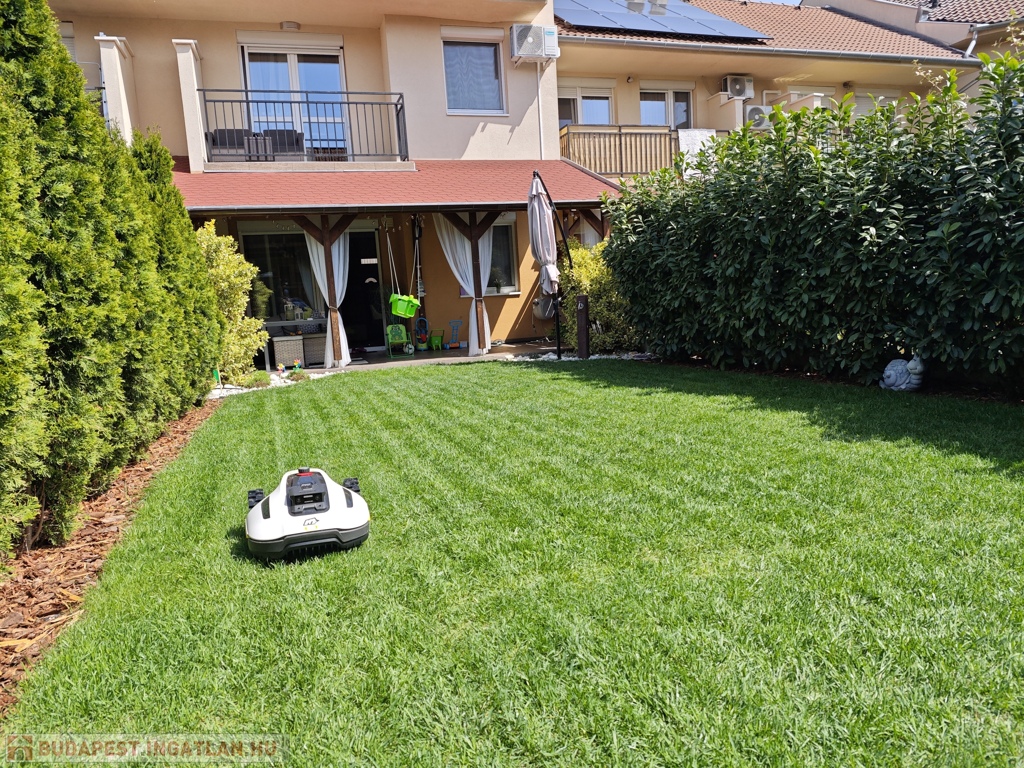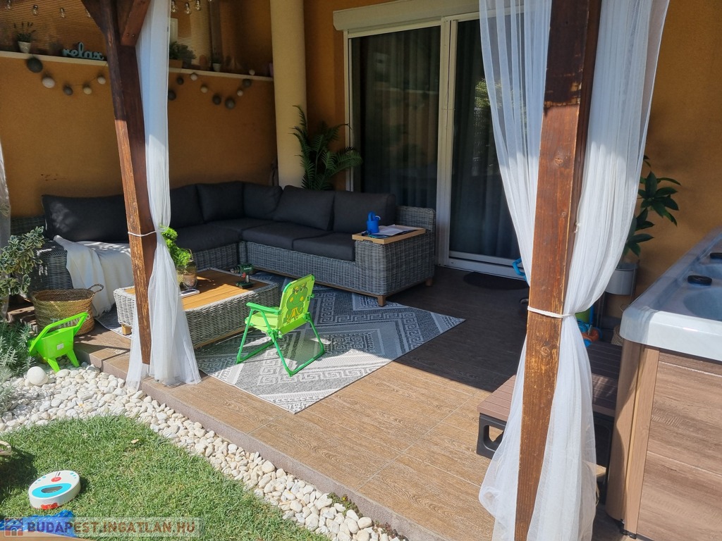 A földszinti terasz fedett, így télen-nyáron remekül használható, egy 4 személyes jakuzzinak és kerti ülőgarnitúrának is helyet ad. A kertben a gyepszőnyeg, az örökzöld tuják és a babérmeggy sövény öntözését automata locsolórendszer biztosítja. A kert végében található egy kb. 4 m²-es faház a kerti szerszámok tárolására.