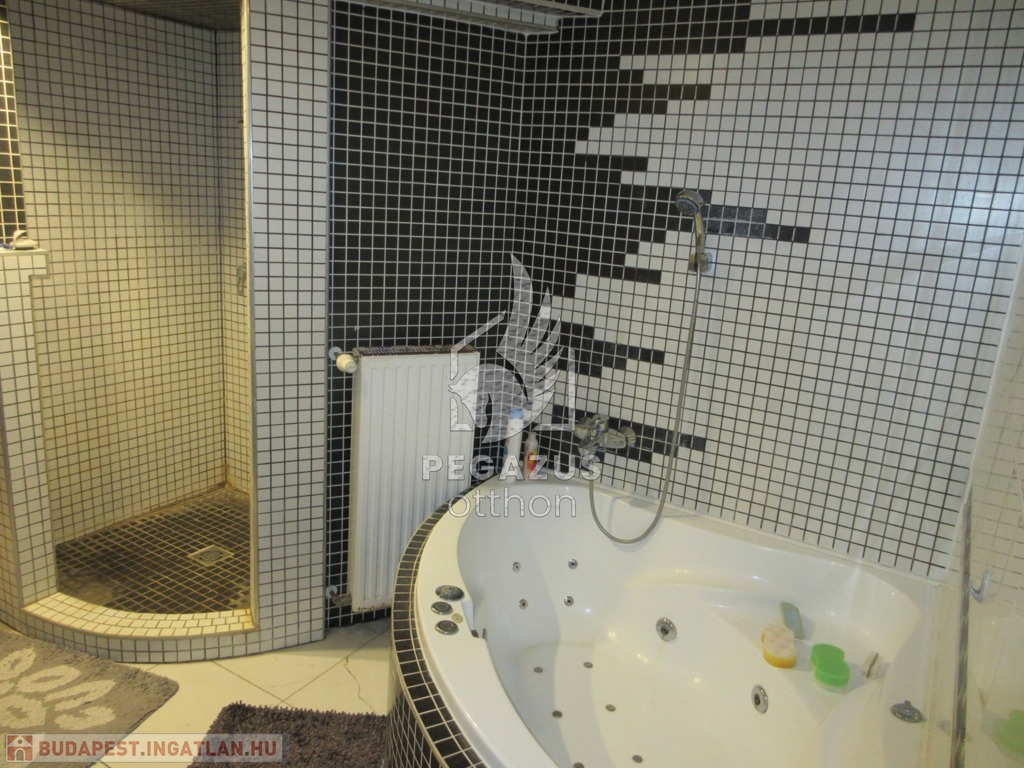 Fürdő: Kádas és zuhanyzós megoldás ikermosdóval, külön mosókonyha és toalett.