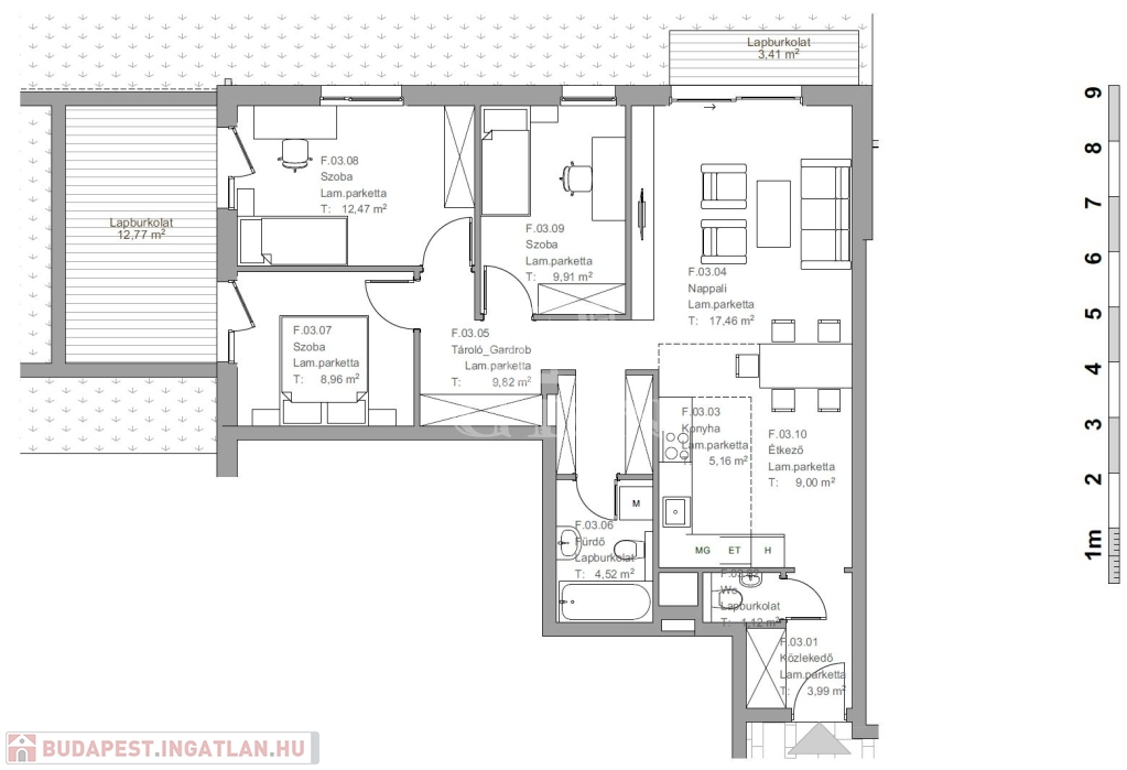 Felosztása a következőképpen alakul: fürdőszoba ( 4.52 nm), amerikai konyhás nappali-étkező (31.62 nm), közlekedő (3.99 nm), 3 szoba (8.96 nm, 12.47 nm, 9.91 nm), wc helyiség (1.12 nm), TÁROLÓ/GARDRÓB (9.82 nm)