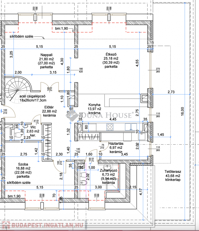 Elosztását tekintve:- Tágas előszoba- Fürdőszoba- Háztartási helyiség- Külön mellékhelyiség- 1 hálószoba - Tágas és világos amerikai konyhás nappali 43 m2-es teraszkapcsolattal