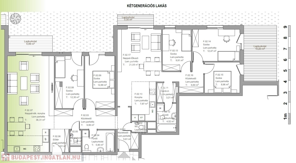 -F.02 lakás 164,3 m2; terasz: 32,85 m2; kert: 168,36 ár: 214.060.000Ft.