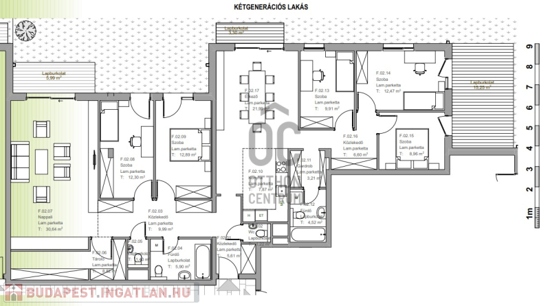 Az épület földszintjén elhelyezkedő lakás extra nagy méretű, nettó alapterülete 164,3 nm. Elvileg két-generációs kialakítású, de a beruházó még egyedi elképzeléseket is meg tud valósítani. Akár két különálló lakás is kialakítható belőle.