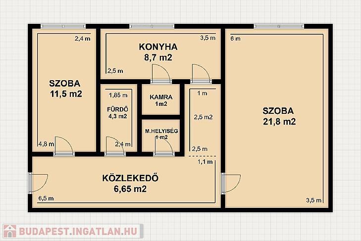 2 szoba, ablakos konyha, zuhanyzós fürdőszoba, mellékhelyiség, kamra.