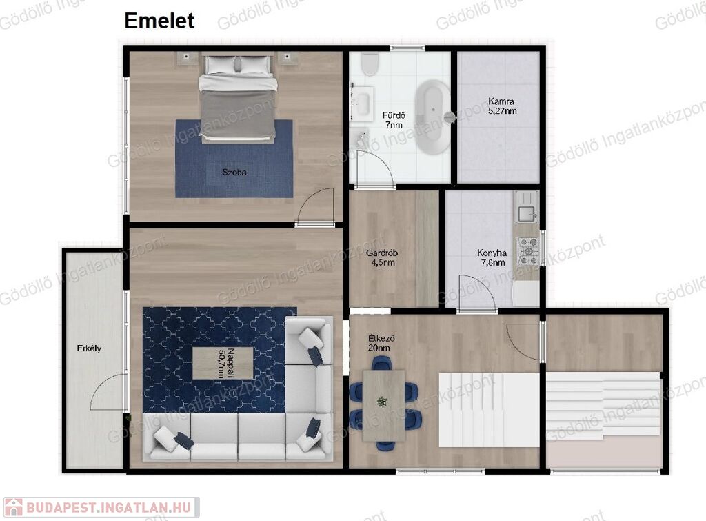 Emeleten erkélyes nappali, étkező, konyha, kamra, egy szoba, kádas fürdőszoba, tároló lett kialakítva. Tetőtérben 3 szoba, közlekedő, egy zuhanyzós fürdőszoba és nagy erkély található.