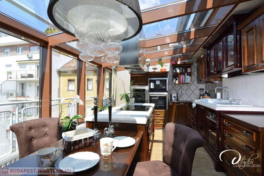 A lakás egyik legimpozánsabb része a tágas, rendkívül világos, nyugati tájolású konyha, amely egész nap kellemes természetes fényt kap. A csendes, udvarra néző, 18,5 m2-es erkély tökéletes hely a pihenésre és kikapcsolódásra.