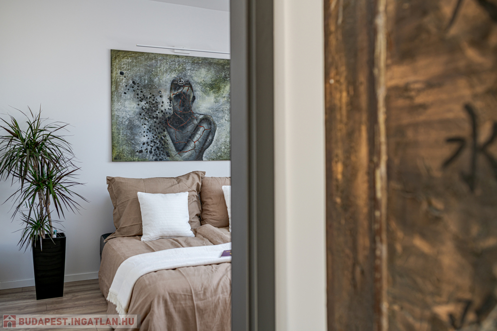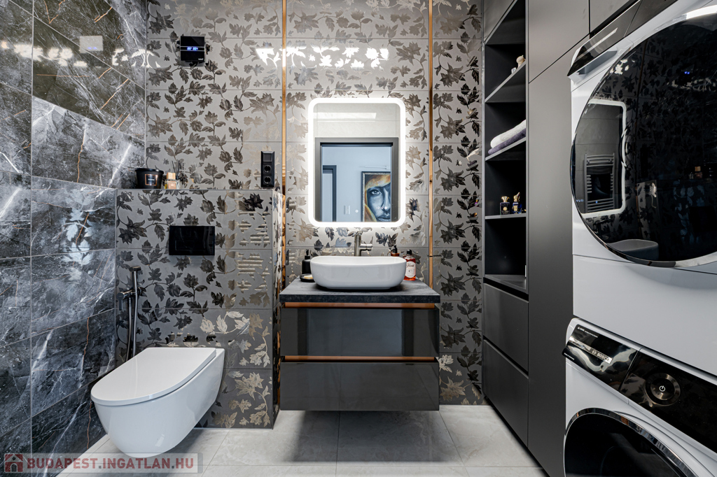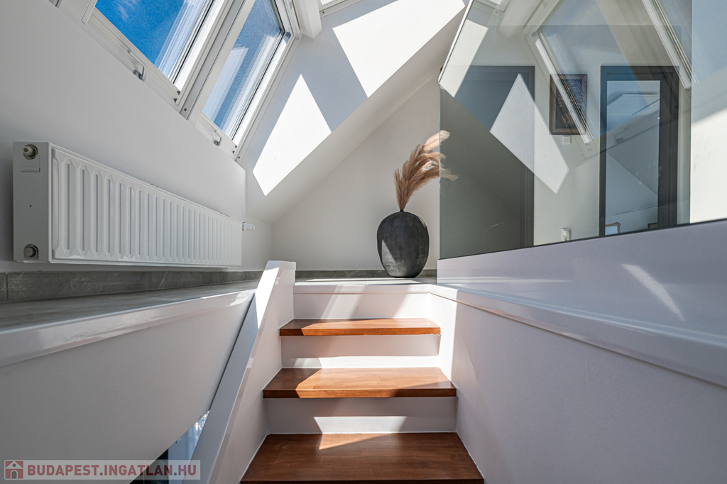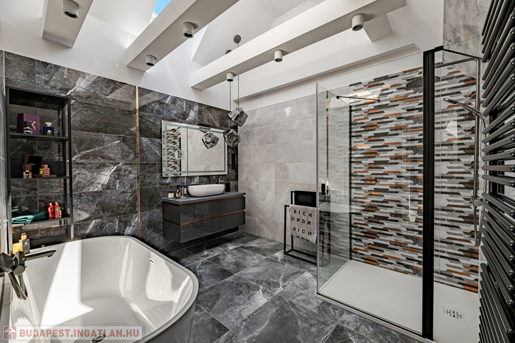 A lakás egyik különlegessége a felső szinten található hatalmas, világos fürdőszoba, a látszógerendákkal, kényelmes méretű zuhannyal, térkáddal, hangulatfényekkel.