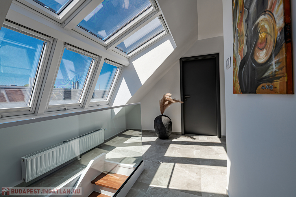 A 3 sorolt manzárdablaknak, köszönhetően fényárban úszik a közlekedő a többi helyiséggel együtt.
