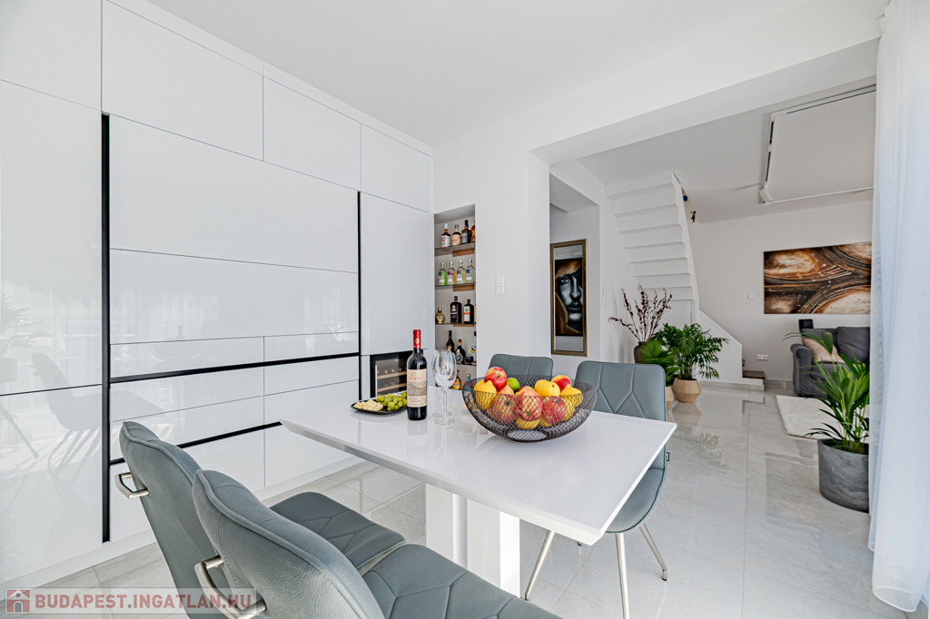 A konyhabútorba és a tálalóba minőségi, Bosch gépek kerültek beépítésre: mosogatógép, szagelszívó, sütő, főzőlap mikró, borhűtő, hűtőszekrény.)