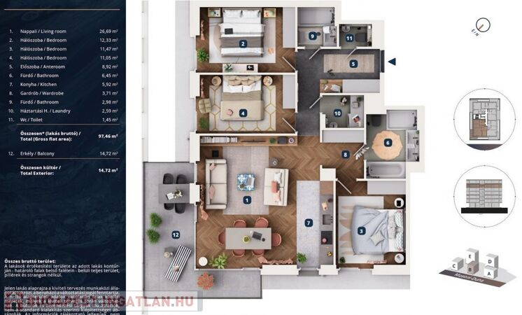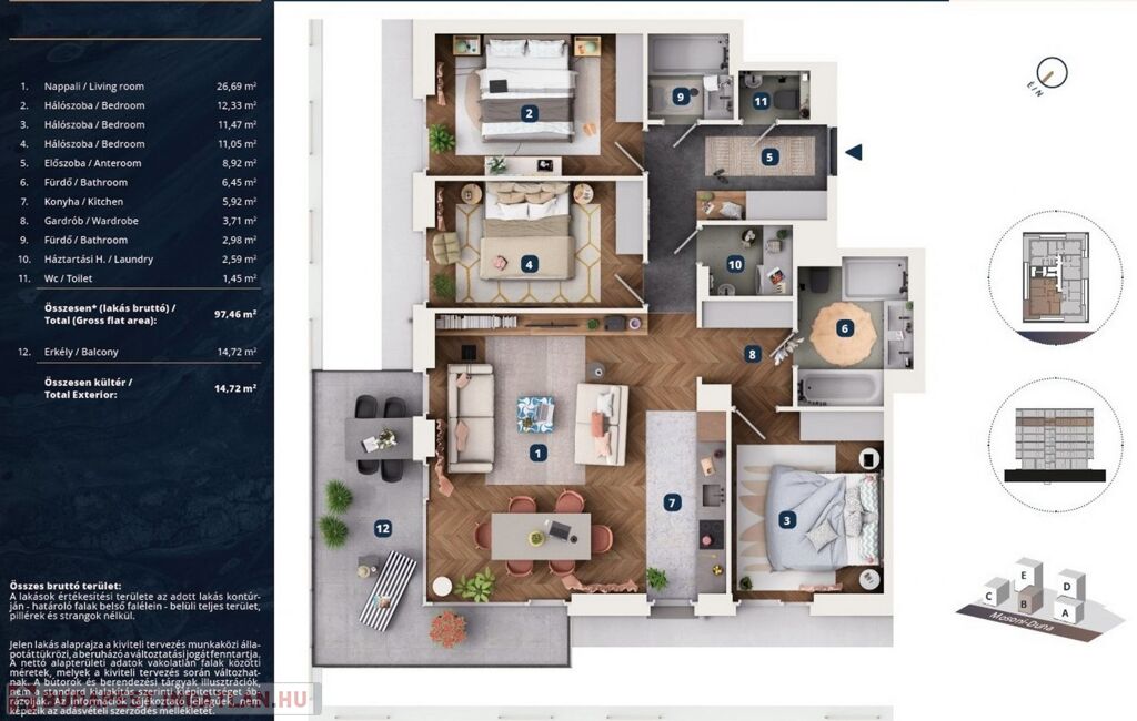 • 97,46 m² alapterület („nettó” 93,56 m2, „bruttó” 97,46 m2 alapterületű)