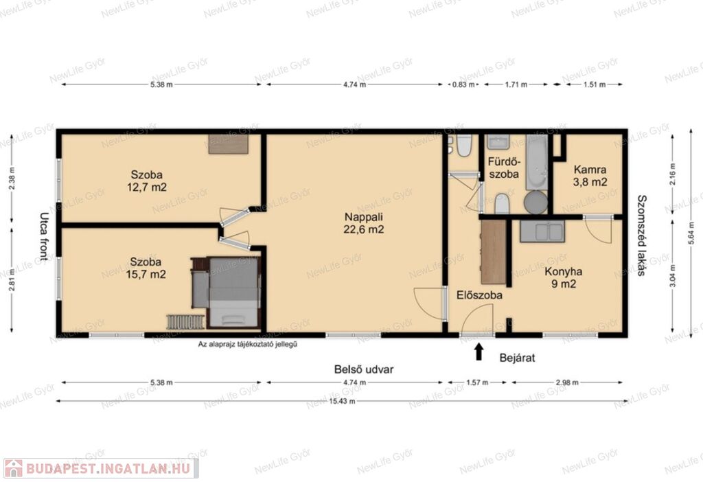 A teljes ingatlan 3 m belmagasságú, igazán tágas térérzetet nyújt.