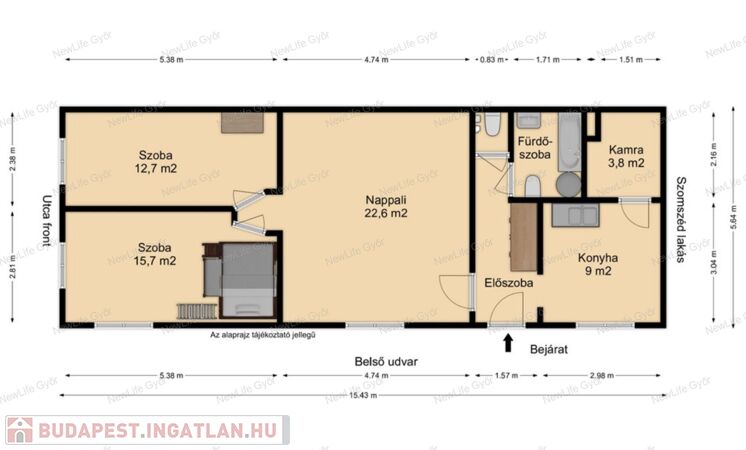 Elosztása: tágas nappali +2 nagy méretű hálószoba, egyikben galéria, fürdőszoba káddal, toalettel, illetve külön mellékhelyiség is kiépült a legutolsó felújítás alkalmával. Tágas konyha kamrával, előszoba beépített gardróbbal.