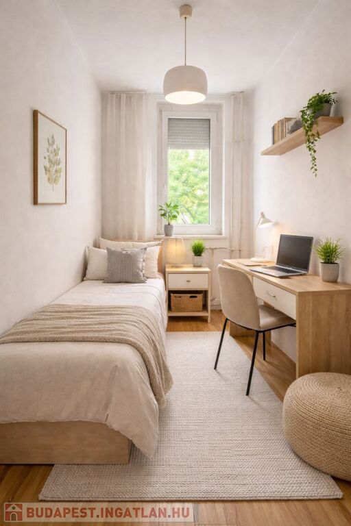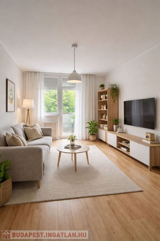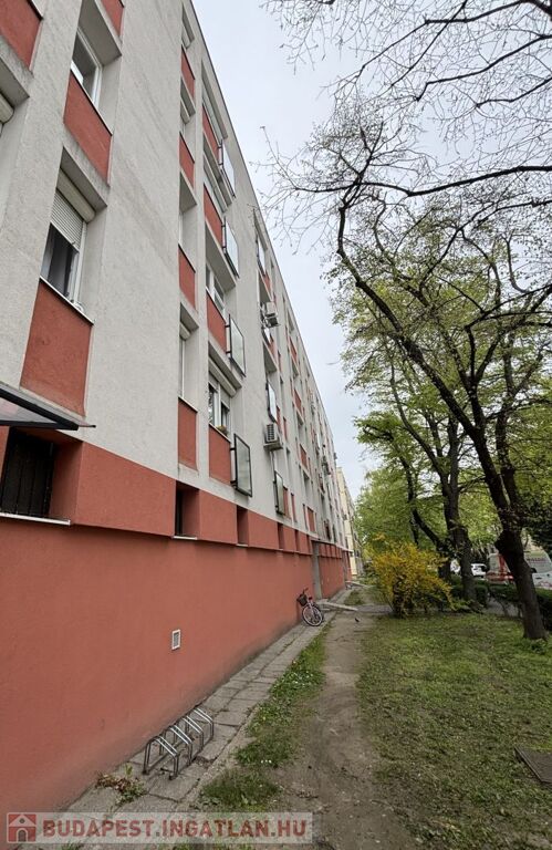 Az ingatlan egy négyszintes társasház első emeletén található, ablakai nem az utcára, hanem egy csendes, fás területre néznek.