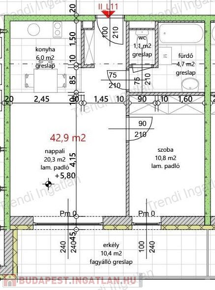 A meghirdetett 2. emeleten található 42,90 nm-es lakásban amerikai konyhás nappali, szoba, fürdőszoba, külön WC, előtér kerül kialakításra. Nappaliból 10,40 nm-es erkély nyílik.