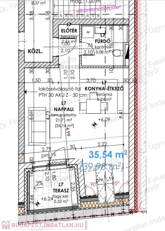 Bruttó lakótér: 39,98 nm / nettó lakótér: 35,54 nm + 5,2 nm terasz, 1 szobás / tetőtéri elhelyezkedésű.