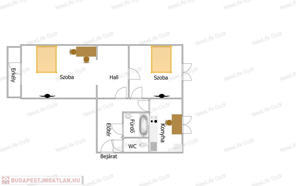 Elosztását tekintve egy előszoba, WC, fürdőszoba, konyha, 2 szoba és hall alkotja.