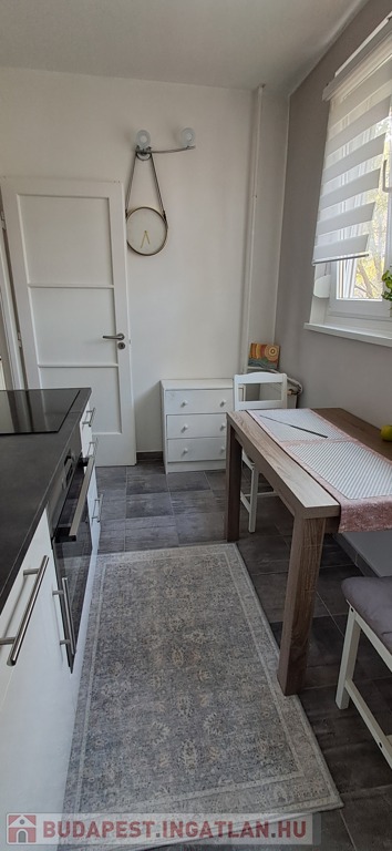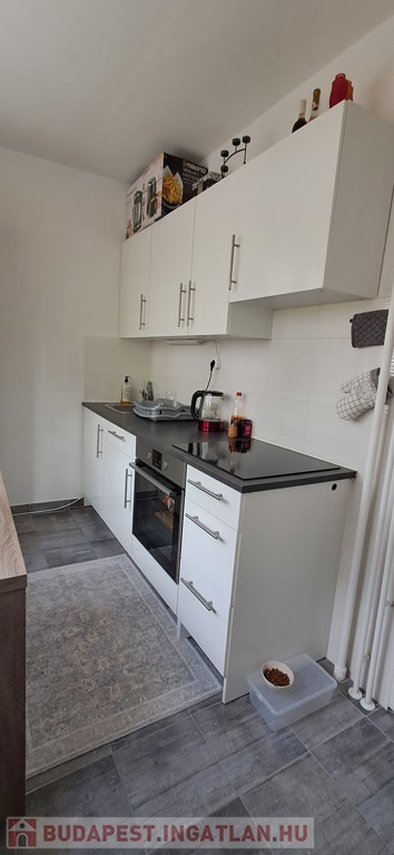 Konyha teljesen felújított, járólapos, ikea konyhaszekrény, beépített sütő és indukciós főzőlap.