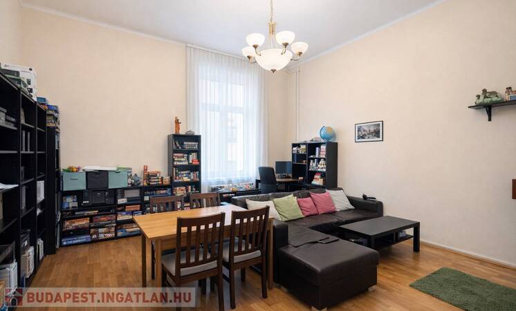 A lakás nagypolgári hangulata azonnal megfogja az embert: nagy ablakok, rengeteg természetes fény, kényelmes elosztás és a 3,5 méteres belmagasságnak köszönhetően, egy olyan tágasság, amit a modern újépítésűek már ritkán adnak.