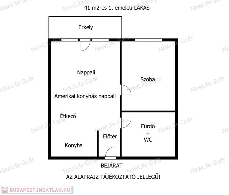 Elosztása: előtér, nappali–konyha–étkező, hálószoba, fürdőszoba–WC